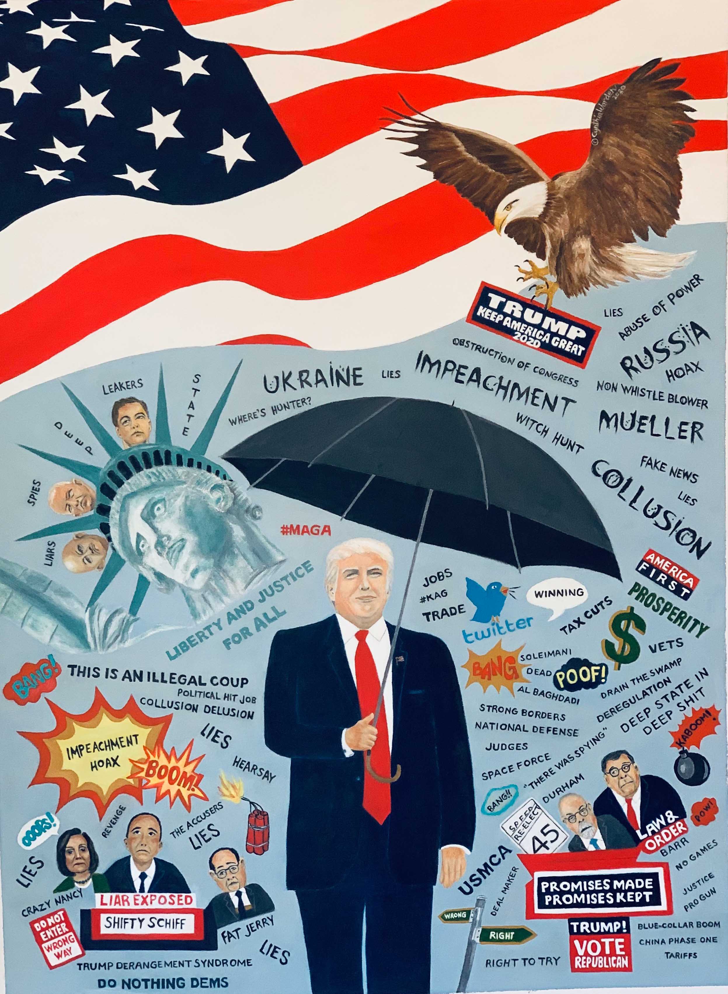 In January 2020 I decided to an oil painting of President Donald Trump. I had seen him with his signature grey umbrella and thought about all the accusations swirling around him after the Mueller Report had come out and had found No Russian collusion. Schiff, Pelosi and Nadler were hell bent to Impeach Trump for anything. Then an anonymous whistleblower accused Trump of Quid Pro Quo regarding a phone call with newly elected Ukranian President and they were off to the races.