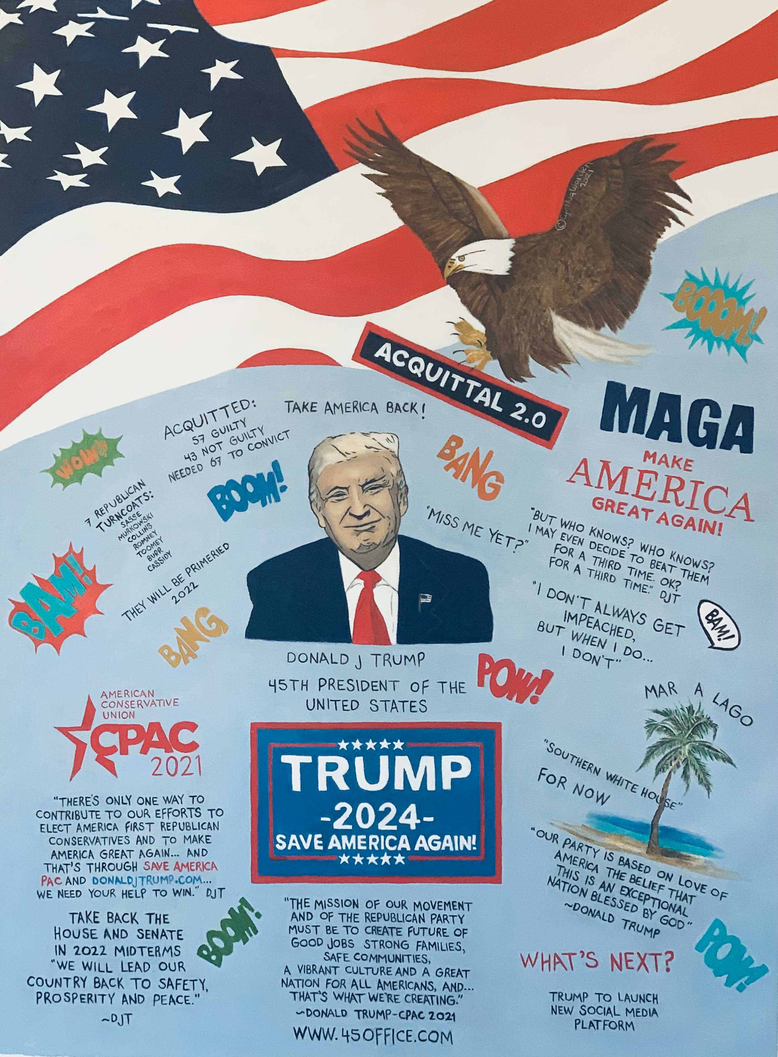 On February 13, 2021 Donald J. Trump, private citizen was Acquitted of all charges. Seven Republicans voted to impeach including Sasse, Collins, Cassidy, Toomey, Burr, Romney and Murkowski. Many Republican voters are very unhappy with their Representatives putting their seats in jeopary in 2022. The vote was 57 Guilty 43 Not Guilty and they needed 67 to convict. Trump now resides in Mar a Lago, Florida. He recently launched a website www.45office.com and he may be launching his own Social Media Platform. He is still the leader of the Republican Party and who knows we may see MAGA Rallies in the near future. Arizona is conducting a Forensic Audit on the ballots in Maricopa County. If this audit yields fraud it could be the domino effect that forces other states to audit as well. To be sure...at some point the truth will be known.