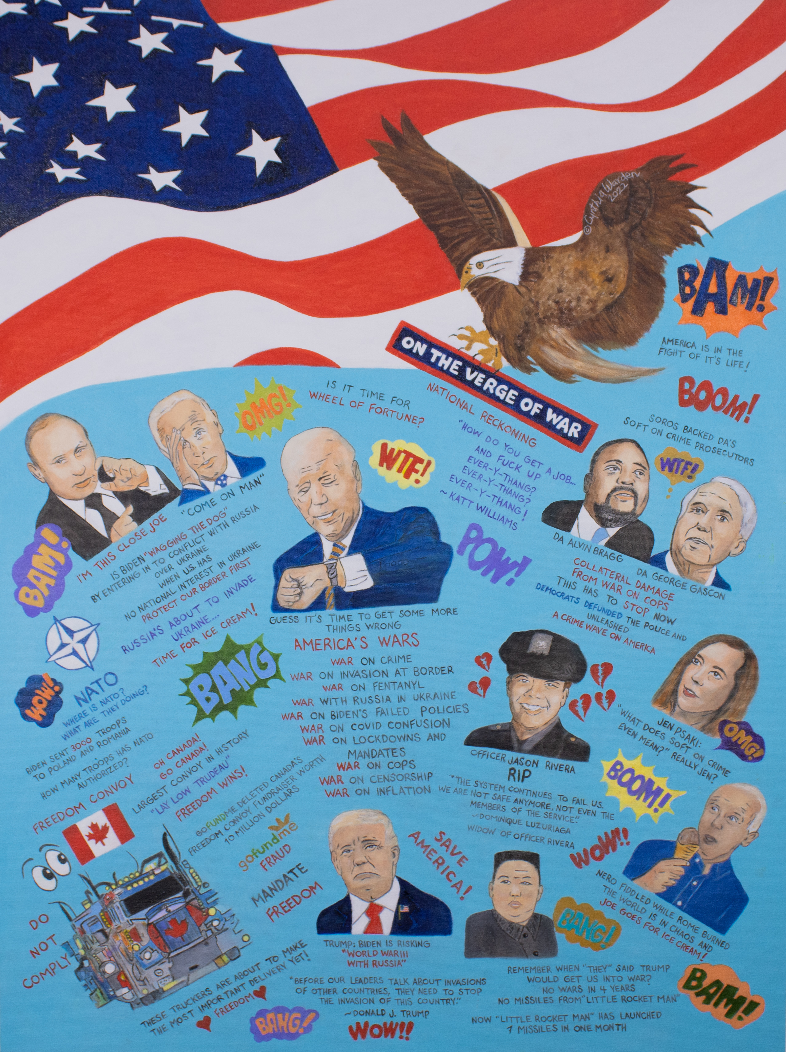 Putin is now advancing his efforts to invade Ukraine. Our NATO allies are nervous as War looms in Ukraine. Biden sends 3000 troops to Romania and Poland as things heat up. The Freedom Convoy is moving across Canada to stop the mandates and Gofundme deletes Canada's 10 million dollars in funds. These truckers are standing up for their freedom. The war on crime rages on as Cops are being killed. DA's like Alvin Bragg NY and George Gascon CA have unleashed a crime wave on Americans. America is in the fight of it's life. "Little Rocketman" is firing off missles at a rate of 7 a month. The worry of WAR is not with just Russia possibly invading Ukraine but we are in a War on crime, War on Fentanyl, War at the Southern Border, War on Covid, War on Mandates, War on Censorship and a War on inflation. A National reckoning is coming and can't come soon enough to stop this.
