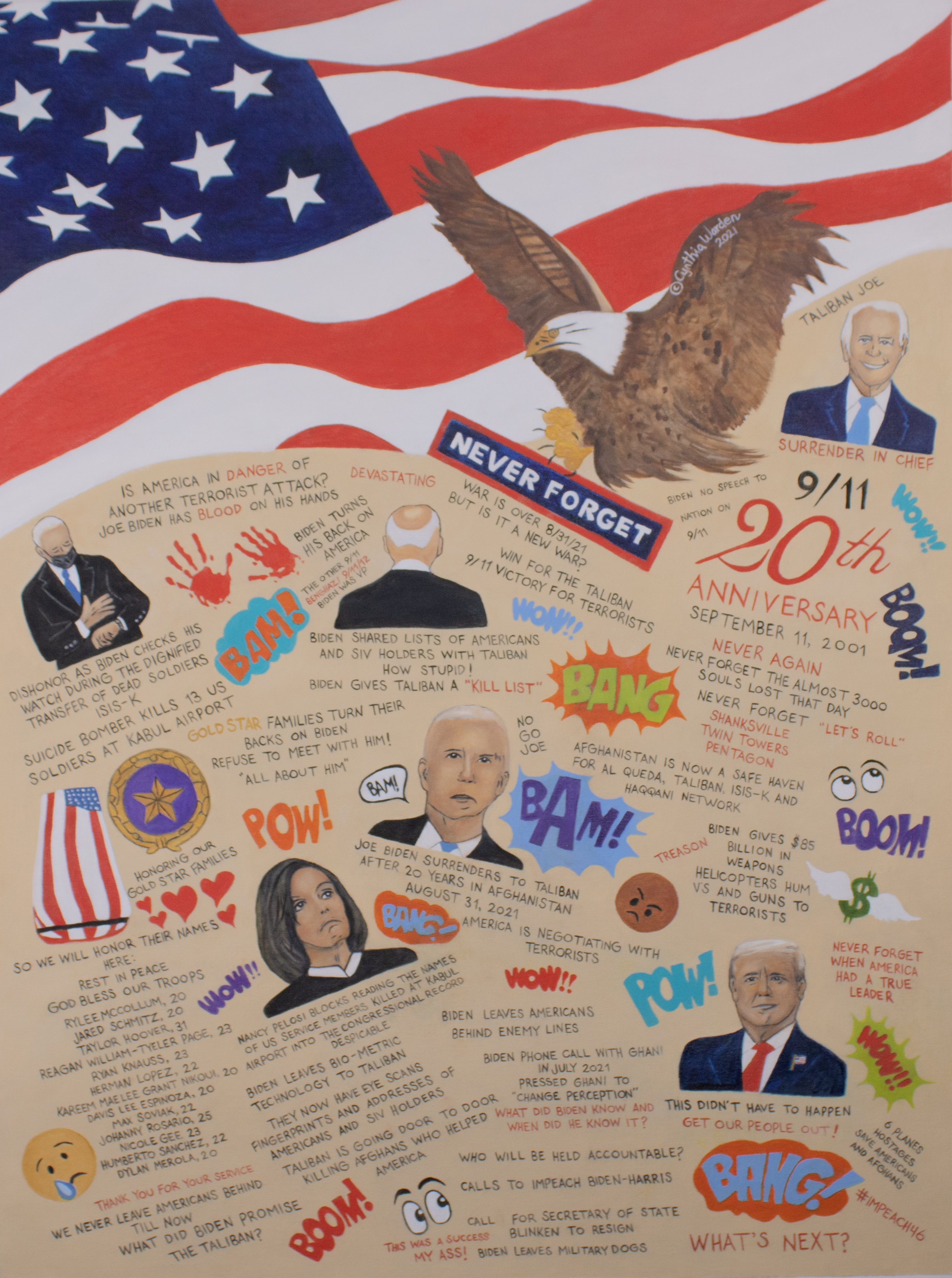 As we head into the 20th Anniversay of the 9/11 attack on America, we stop to honor the memory of the three thousand that perished in the Twin Towers, the Pentagon and Shanksville. We will Never Forget. But on this day of all days, Joe Biden surrenders Afghanistan to to Taliban. As events unfold Americas saw the televised withdrawl of our military before our citizens and our Afghan partners. Thirteen American soliders were murdered at Abbey Gate in Kabul. As their bodies in flag draped caskets arrived for the Dignified Transfer, Biden was seen checking his watch numerous times to the disgust and anger of the new Gold Star families. Nancy Pelosi blocked the reading of the names into the Congressional Record as Americans watched in horror the Biden Administration leave Billions of dollars of military equiptment and weaponry including Bagram Air Force Base in Taliban hands. Afghanistan is now a safe haven for Al Queda, Taliban, ISIS-K and the Haqqani Network. This will go down in history as one of the worst decisions a President of the United States could have made. Our allies don't trust us and the state of the world is in a higher state danger. Also we must mention on September 11, 2012 the attack on Benghazi occurred killing 4 including Ambassador Christopher Stevens. Joe Biden was Vice President. Who will be held accountable? Is America in danger of another terrorist attack because of this botched withdrawl?
