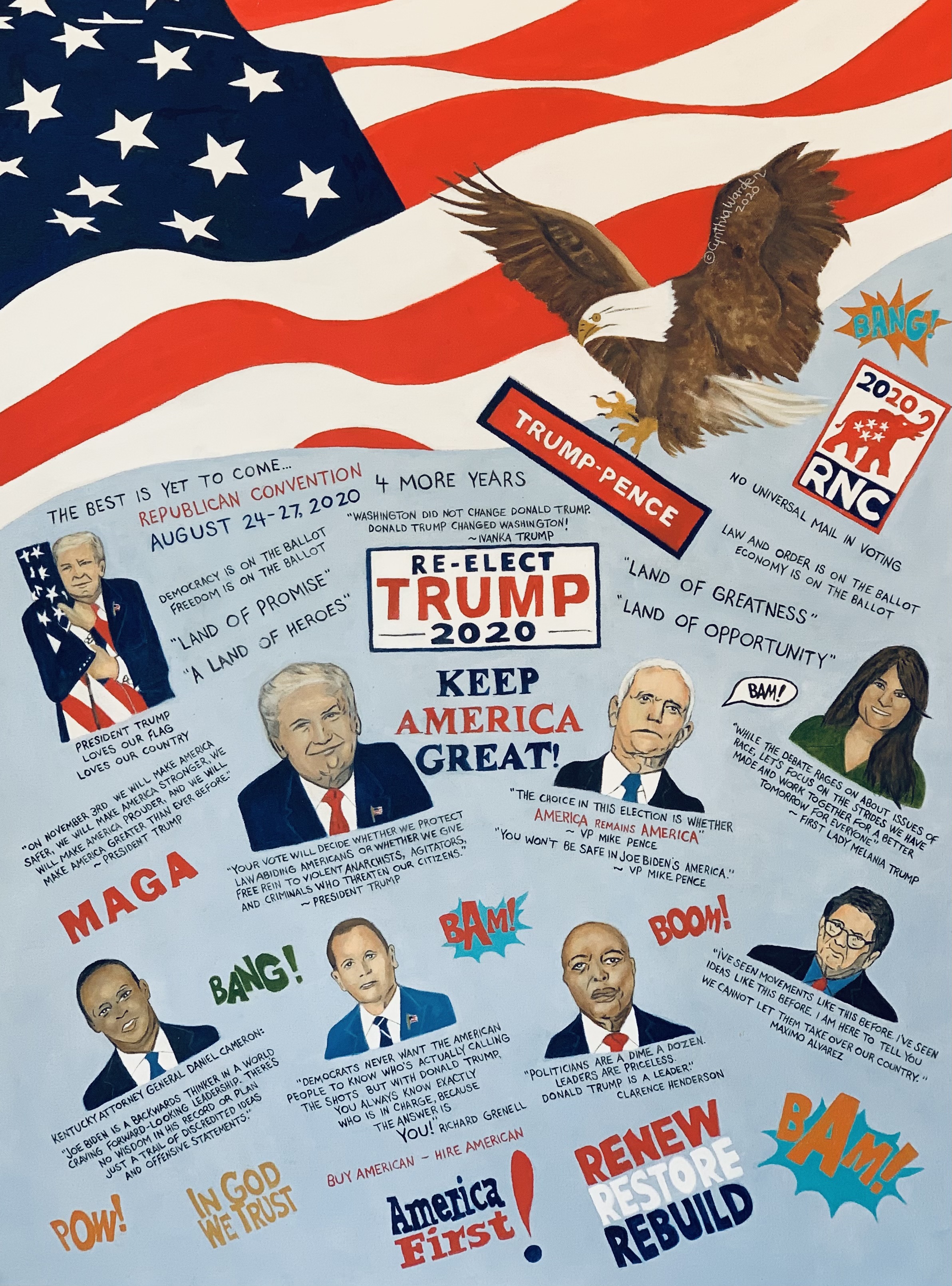 On August 24, 2020 Donald J. Trump was officially nominated for a second term as the 45th President of the United States at the Republican National Convention. The phrase "The Best is Yet to Come" was the theme. Other themes included "America First," "Land of Greatness," "Land of Opportunity," "American Heros," "Law and Order," and "Keeping America... America." There were powerful and patriotic speeches and warnings of Socialism,Communism and the biggest warning regarding the upcoming election with voter fraud and the use of Universal Mail in Ballotts.